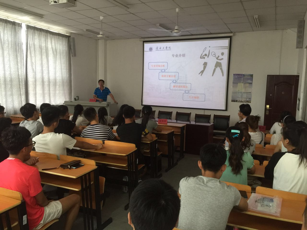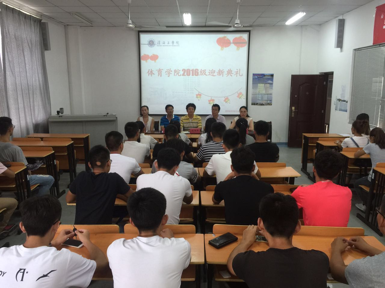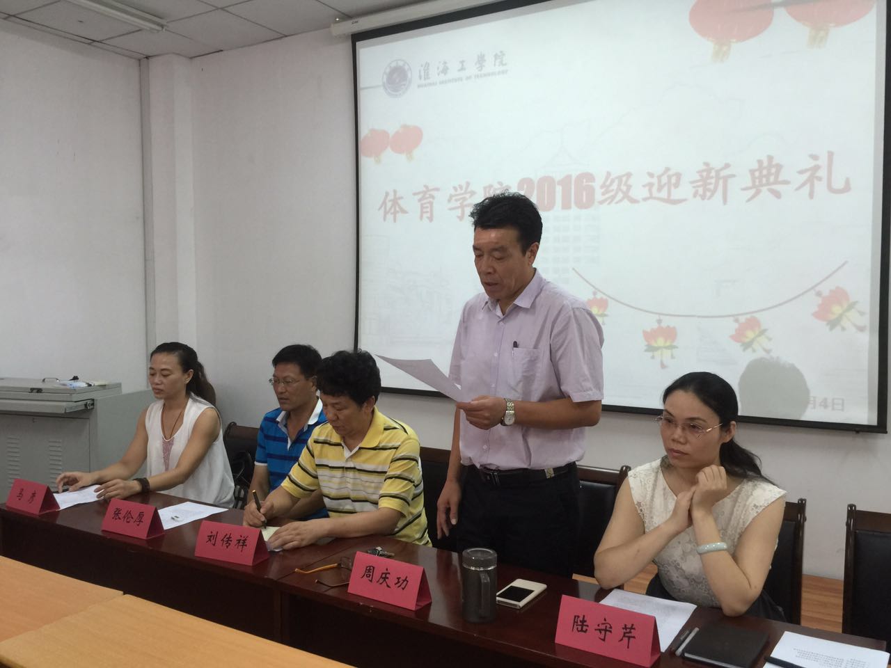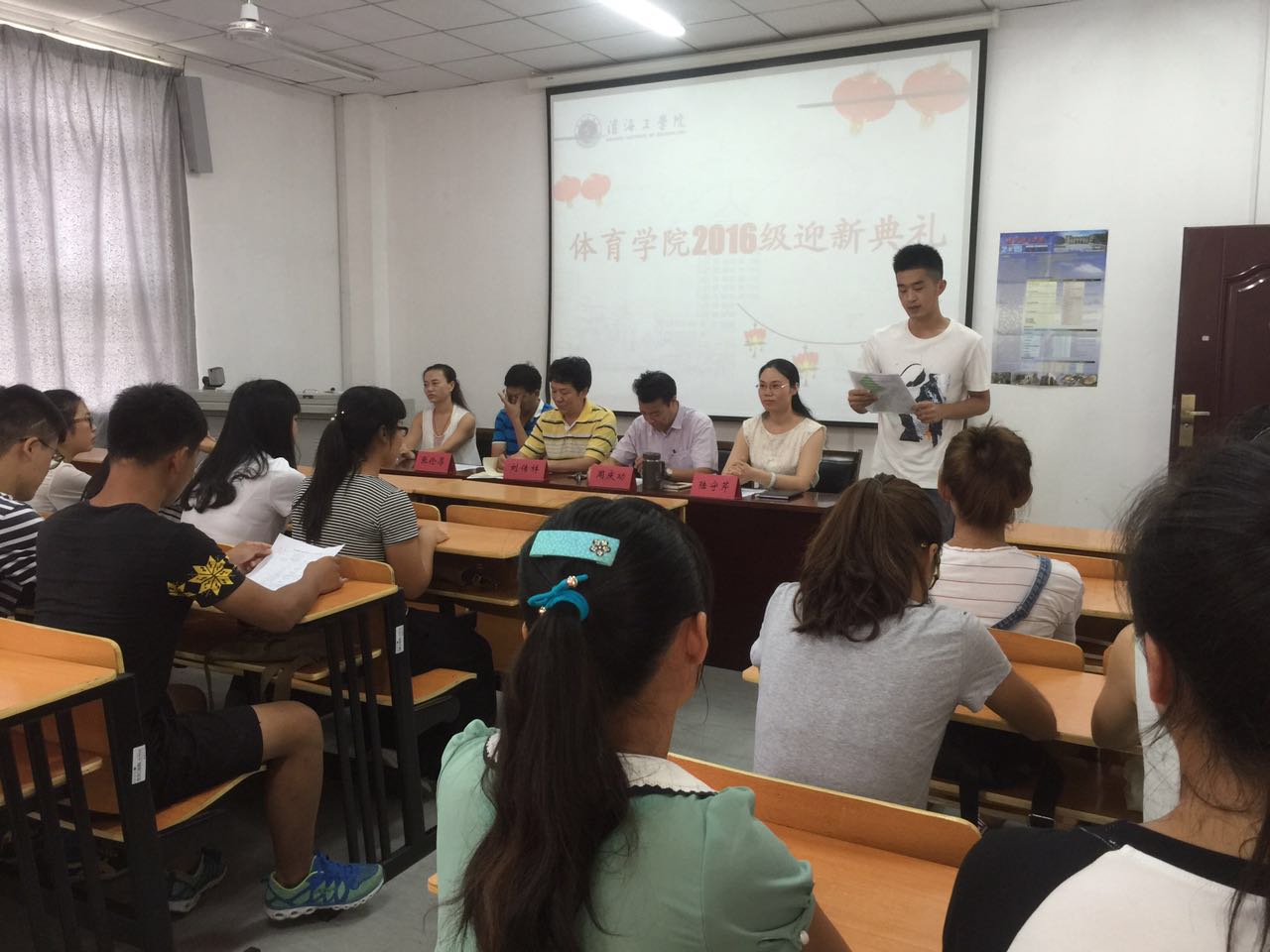 一年一度的迎新工作在节日般的氛围中顺利进行,体育学院迎来39名2016级新同学们,新生们英姿勃发,为美丽的淮海园又增添一道亮丽独特的风景线。为迎接休闲体育专业同学们的到来,体育学院于2016年9月4日上午8:30举行2016级迎新典礼活动,体育学院党总支书记刘传祥、体育学院院长周庆功、体育学院副院长张伦厚、休闲体育系系主任马彦、班主任陆守芹及班主任助理郭丹丹及全体新生们参加了本次活动。