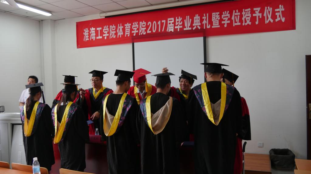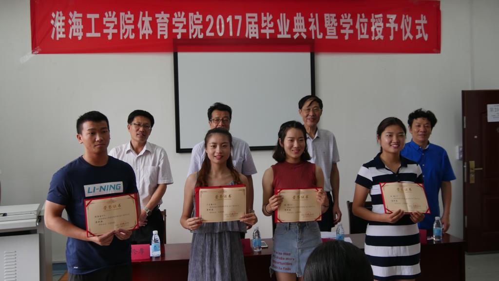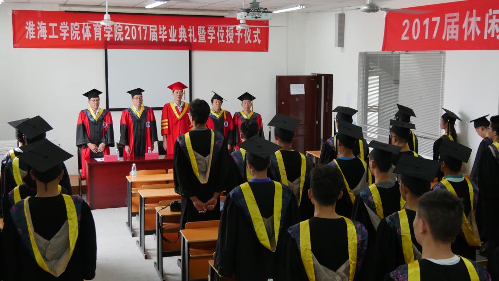 本次毕业典礼由体育学院党总支书记刘传祥老师主持,典礼开始后师生们全体起立,共唱国歌,典礼程序正式开始。首先体育学院副院长张伦厚老师宣布获得2017届优秀毕业生学生名单(分别为:魏如梦、刘雅静、倪佳佳三位同学)、体育学院2017年考研奖学生名单(杨丽同学考取上海体育学院研究生,倪佳佳同学考取武汉体育学院研究生,王艳同学考取杭州师范大学研究生,卜文倩同学考取扬州大学研究生),与会领导为获奖同学们颁发证书。体育学院院长周庆功老师宣读了体育学院2017届本科毕业生学士学位授予名单。毕业生代表魏如梦同学发言,追忆自己四年的大学生活,见证校园四年的蓬勃发展,表达学生们对老师及学校的感激之情。体育学院院长周庆功老师为毕业生们致辞,值毕业生们即将走出校门,走向社会,寄语毕业生们从崭新的起点出发,学会感恩,感恩父母,感恩老师,感恩身边每一个人,不断努力奋斗,成为社会的有用之才。淮海工学院副院长杜军老师为体育学院休闲体育专业首届毕业生致辞,杜院长谆谆教诲,语重心长,寄希望于每一位休闲体育专业的毕业生,从小事做起,锐意进取,开拓创新,成为各行业的中坚力量,为母校争光添彩,让母校以你们为荣。之后体育学院的导师们为2017届毕业生颁发学位证书并合影留恋。最后,在激昂的淮海工学院校歌声中,体育学院2017届毕业生毕业生典礼暨学位授予仪式圆满结束。