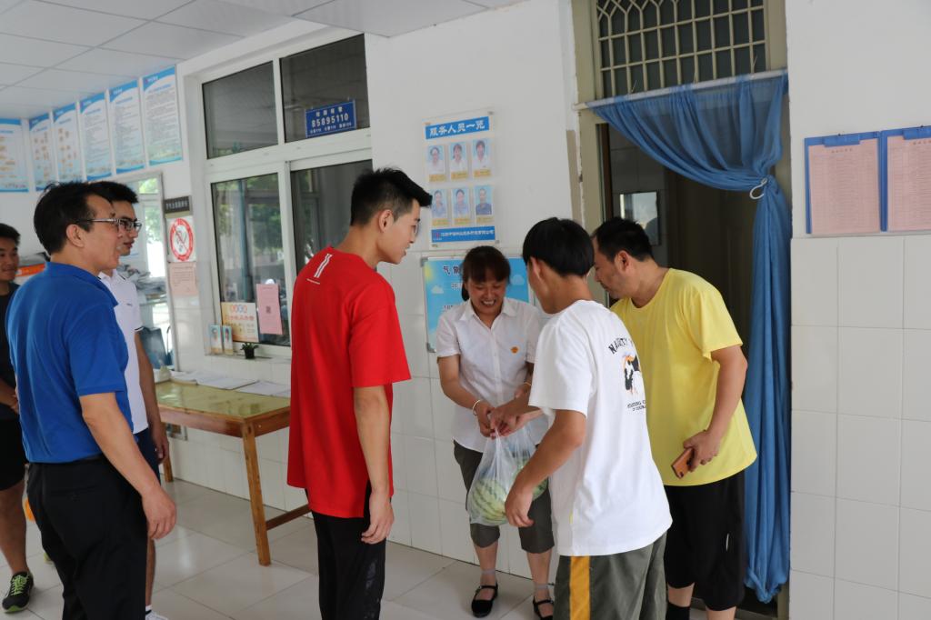 走访慰问中,周庆功老师跟同学介绍了江苏省省内体育专业研究生招生院校的情况,与同学们一同交流研究生专业选择的问题以及专业课复习备考的技巧,让同学们非常受益。阙建定老师询问了学生的学习状态、生活中的困难问题,充分肯定了同学们积极考研的热情,同时嘱咐学生要做到劳逸结合,注意休息、防暑,同学之间要团结互助,共同度过一个快乐充实的暑假。最后,体育学院师生们一起慰问了宿舍值班阿姨,对她们细致辛勤关怀学生表示感谢,并要求同学要密切配合阿姨,做好清洁卫生工作,严格遵守作息时间。