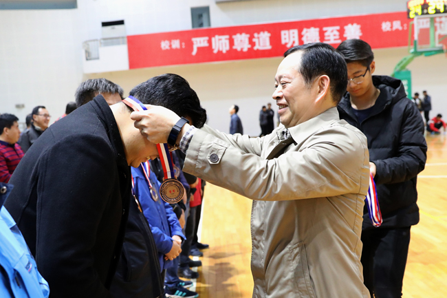 11月9日下午,由校工会、体育学院联合举办的2018年教职工男子篮球比赛在苍梧校区体育馆圆满落幕,进行了隆重的颁奖仪式。校党委副书记史顺良及主办单位领导为获奖单位和队员分别颁发了奖杯和奖牌。仪式结束后,甲组冠军机关队与体育学院教职工队进行了精彩的友谊比赛。