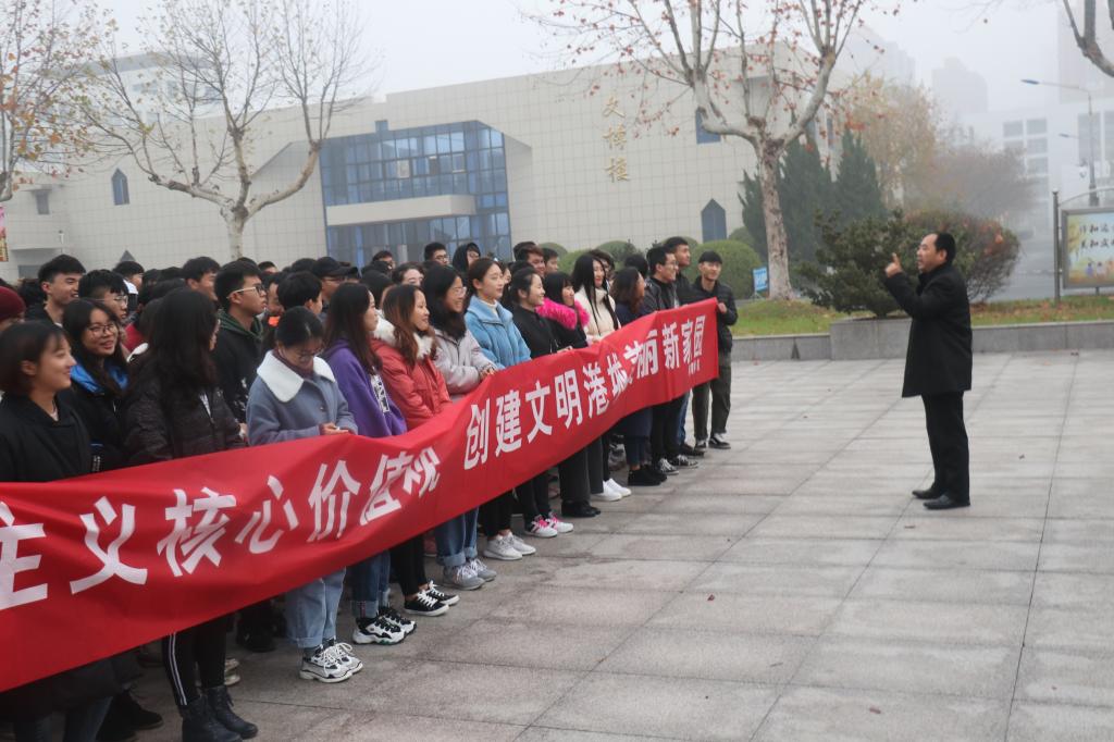 院党总支书记阙建定讲话,他强调,作为当代大学生,践行社会主义核心价值观要着重落实在行动上。要把正确的道德认知、自觉的道德养成、积极的道德实践紧密结合起来,自觉树立和践行社会主义核心价值观,要倡导社会文明新风,带头学雷锋,积极参加志愿服务,主动承担社会责任,热诚关爱他人,多做实事好事,以实际行动促进社会进步。结合当前连云港市文明城市创建,阙书记说:“创建全国文明城市是贯彻落实科学发展观的具体实践,也是构建和谐社会、推动“高质发展,后发先至”的重要动力。作为连云港本科院校的大学生,我们应该增强文明创建的使命感、责任感、自觉性,积极参与到文明城市的创建中,希望全体同学要熟知社会主义核心价值观、文明院校建设“六个好”条件等应知应会知识,切实做到举止文明,遵守秩序,爱护公物,美化环境,热心公益,维护安定,讲究卫生,保持整洁,谈吐文雅,待人礼貌,移风易俗,树立新风。”