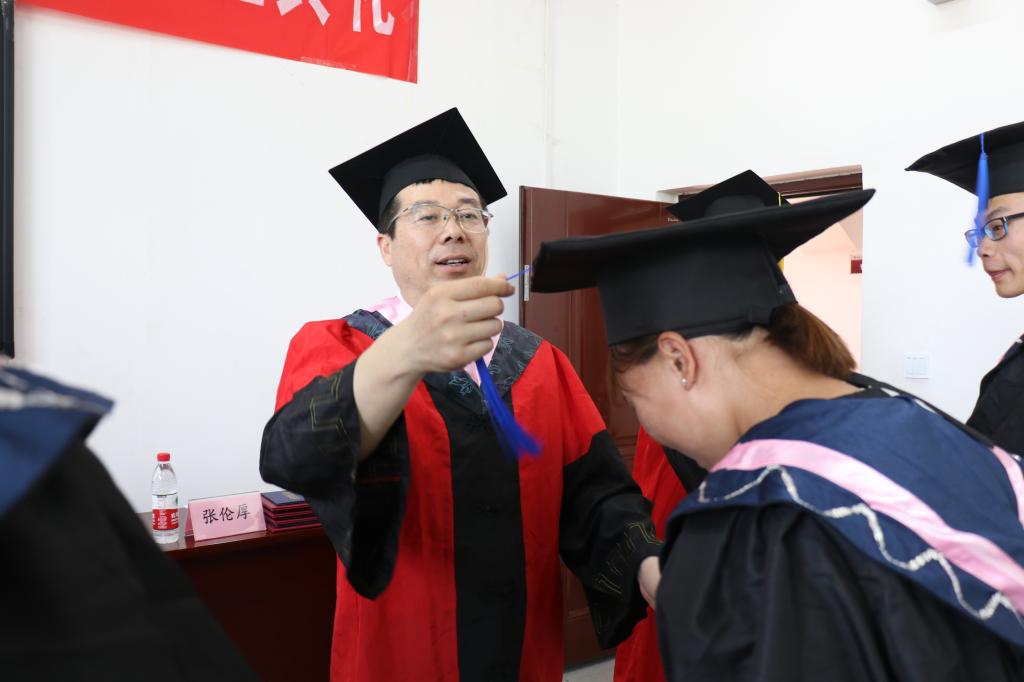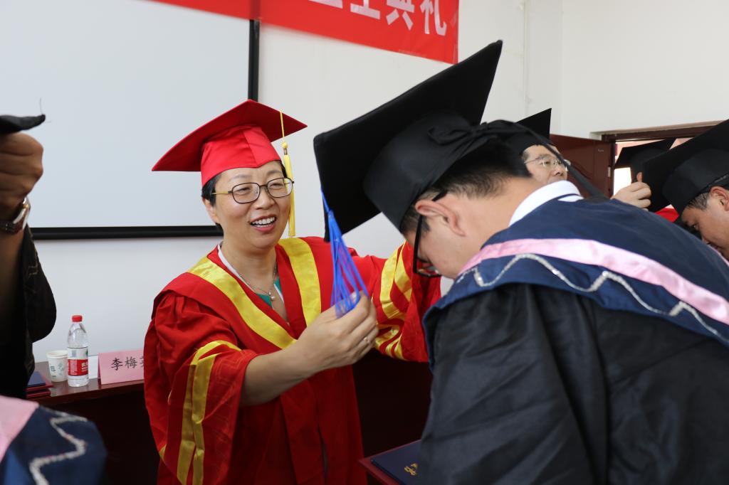 最后,副校长李梅英教授和学院党政领导为在场的每一位毕业生颁发学位证书、扶正流苏,并与他们合影留念。