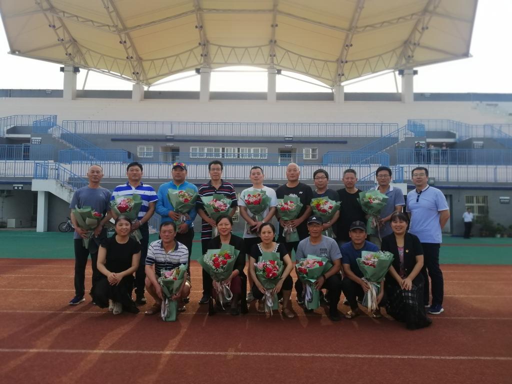 会后学院工会为从教30年以上的教师们发放了慰问礼品,领导班子成员在运动场上和老师们合影留念。