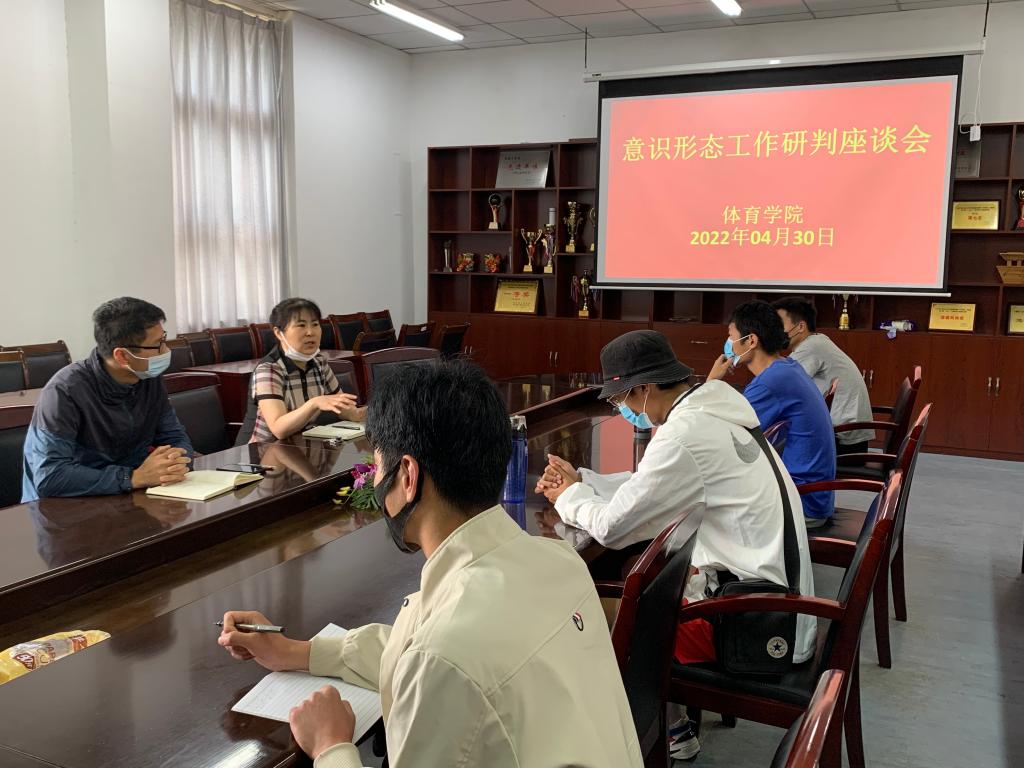 疫情发生以来,体育学院党总支认真贯彻学校相关部署,随着学校疫情防控工作的开展,即将有序恢复线下教学工作,为了更好地了解同学们的思想状况,4月30日上午体育学院在会议室召开意识形态工作研判座谈会。学院党总支书记张萍出席座谈会,团学组织主要学生干部参加了会议。会议由院团委副书记仝友鹏主持。