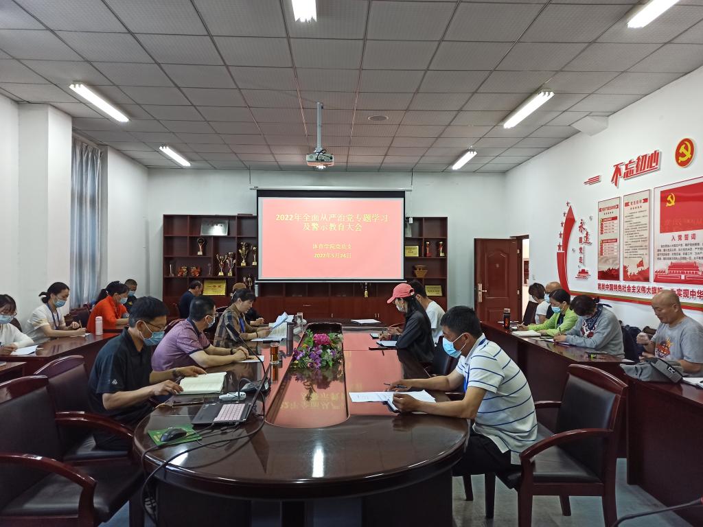 2022年5月24日上午,体育学院在学院会议室召开全面从严治党专题学习及警示教育大会,会议由党总支书记张萍主持,学院领导班子成员、各系室中心正副主任、全体党员参加了会议。