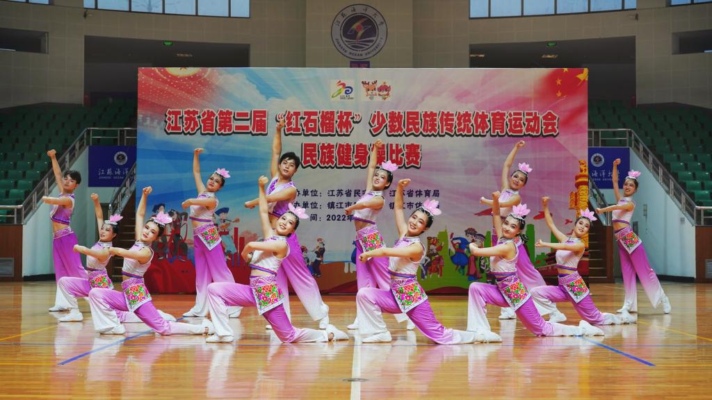 为备战2023年全国第十二届民族运动会,江苏省第二届“红石榴杯”民族健身操由省民族宗教事务委员会、省体育局主办。因疫情影响民族健身操比赛首次以线上比赛、线下评判的方式进行。主会场设在镇江市,省市领导、裁判员、嘉宾在主会场通过现场大屏观看参赛实况录像,裁判员进行评判,观众通过 5G 云直播,线上观看比赛。