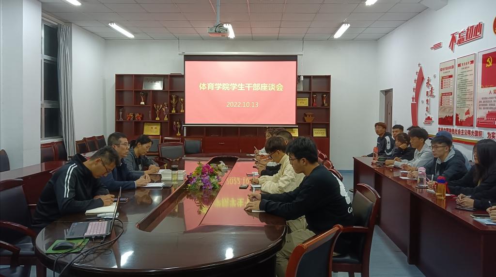 10月13日晚上体育学院在会议室召开学生干部座谈会,体育学院院长赵宏、党政办公室主任张桂玲及各班班长、团支书等参加会议,会议由学工办副主任仝友鹏主持。
