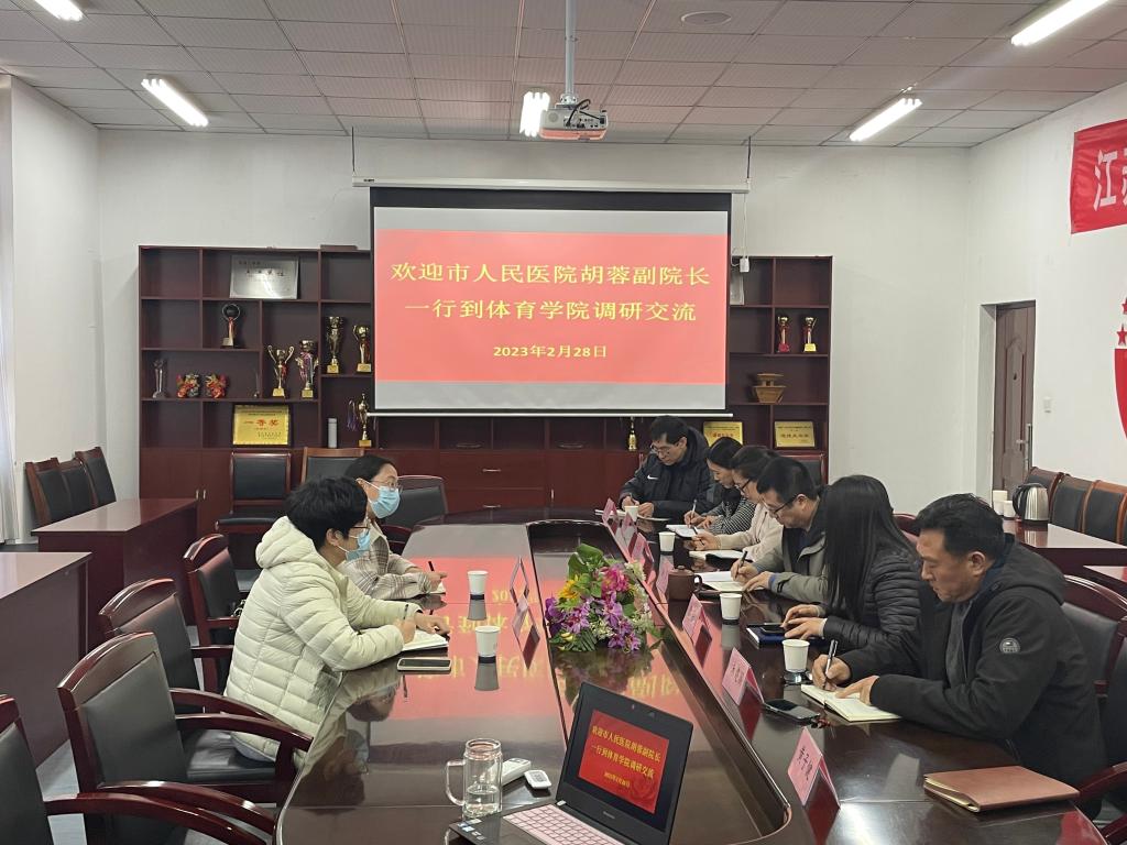 院长赵宏代表体育学院对胡院长一行的到来表示欢迎。胡蓉介绍了连云港第一人民医院的基本情况。希望通过双方合作,借助医院运动医学和康复学等学科力量,充分发挥医疗诊疗优势,利用江苏海洋大学体育学院平台,实现科研创新合作和医体科研平台的搭建。