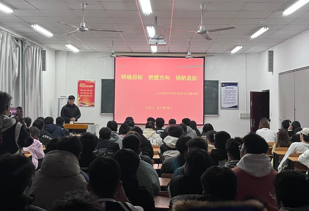 为让同学们进一步明确学习的目标,构建优良学风,不断践行社会主义核心价值观。体育学院于3月27日晚在212教室举行“明确目标 把握方向 扬帆起航”学风建设主题讲座。本次讲座由体育学院青年教师、在读博士黄子健老师主讲,体育学院全体学生参加。