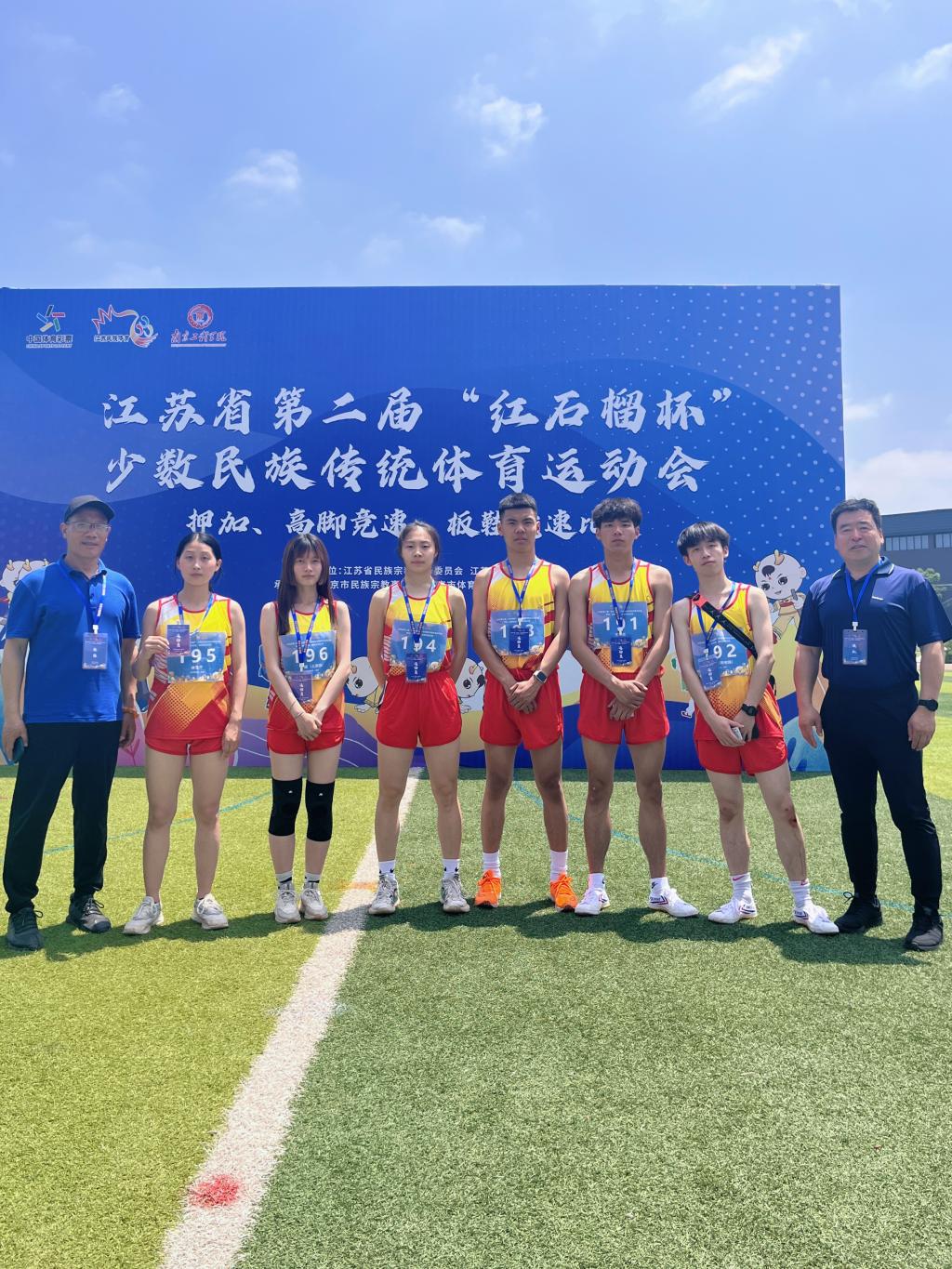 2023年5月19日上午,由江苏省体育局、江苏省民族事务委员会主办,南京市体育局、南京市民族宗教事务局承办,江苏省第二届“红石榴杯”少数民族体育运动会板鞋竞速比赛在南京工程学院开幕。本次比赛共有南京市、无锡市、连云港市等11个代表队参赛,江苏海洋大学板鞋队代表连云港市参赛,经过两天的激烈角逐,我校板鞋队荣获一项二等奖、一项三等奖的好成绩。