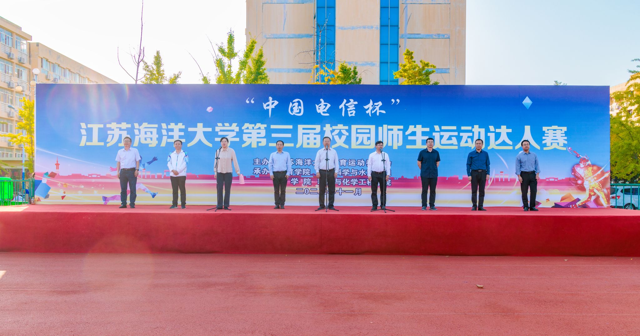 11月1日下午,江苏海洋大学“中国电信杯”第三届校园师生运动达人赛在苍梧校区西运动场隆重开幕。校长宁晓明、副校长马廷淮出席开幕式,相关学院和职能部门负责人参加开幕式,校运动委员会副主任、工会主席万洁主持开幕式。