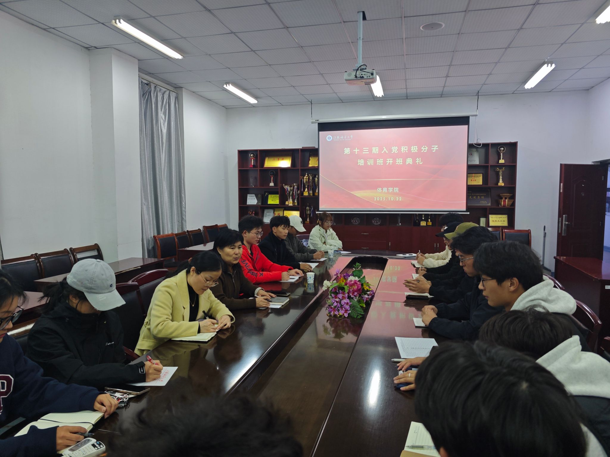 10月22日,体育学院第13期入党积极分子培训班开班典礼在学院会议室举行,学院党总支书记张萍、党政办赵曼洁老师及全体学员参加典礼。
