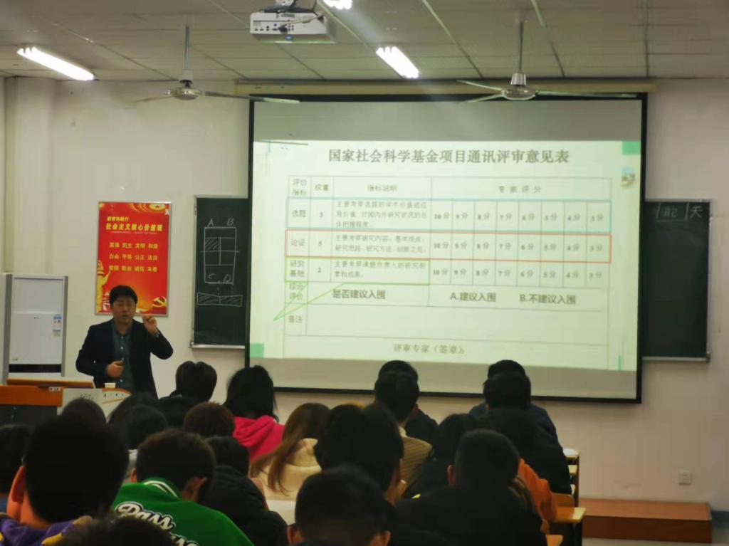 郇昌店博士以多年申报课题、获得立项的写作者的身份,向与会的师生分享写作申请书的经验。郇博士首先鼓励大家积极申报课题,只有申报,才有机会获得立项。郇教授强调,在选题时一定要仔细研读申报公告,关注体育发展的时代发展需求,特别是一些重大问题、重大工程、重大事件和重大指示,并对选题提出合理的建议。郇博士还就课题论证过程中的课题题目如何拟定、文献综述如何述评、研究内容如何构建、创新之处如何描述、研究基础如何选择等具体细节进行精彩而有趣的讲述。