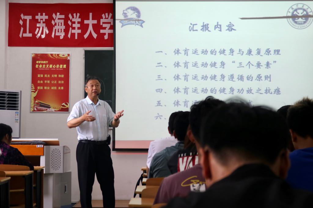 王朝军教授围绕体育运动的健身与康复原理、运动健身“三要素”、体育运动健身遵循的原则、体育运动的健身功效之抗癌等六个方面展开,并现场示范了持杖健步走的动作和注意点,鼓励同学们不仅要自己坚持体育锻炼,还要带动周边人们一起运动健身,共同走出快乐、走出时尚、走出健康、走出美好的未来!