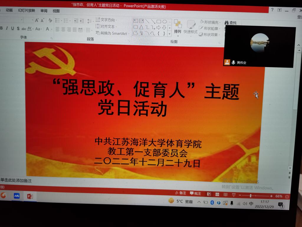 为充分发挥党建的引领作用,搭建课程思政建设交流平台,强化教研室和课程思政教学团队的组织作用,建立健全课程思政教研制度,推进体育课课程思政建设。2022年12月29日下午,体育学院教工第一党支部在线开展“强思政、促育人”主题党日活动。作为体育学院教工第一党支部的联系人严云洋副校长参加了支部活动,活动由支部书记黄伟业主持,教工第一党支部全体党员和教师参加了活动,学院领导列席活动。