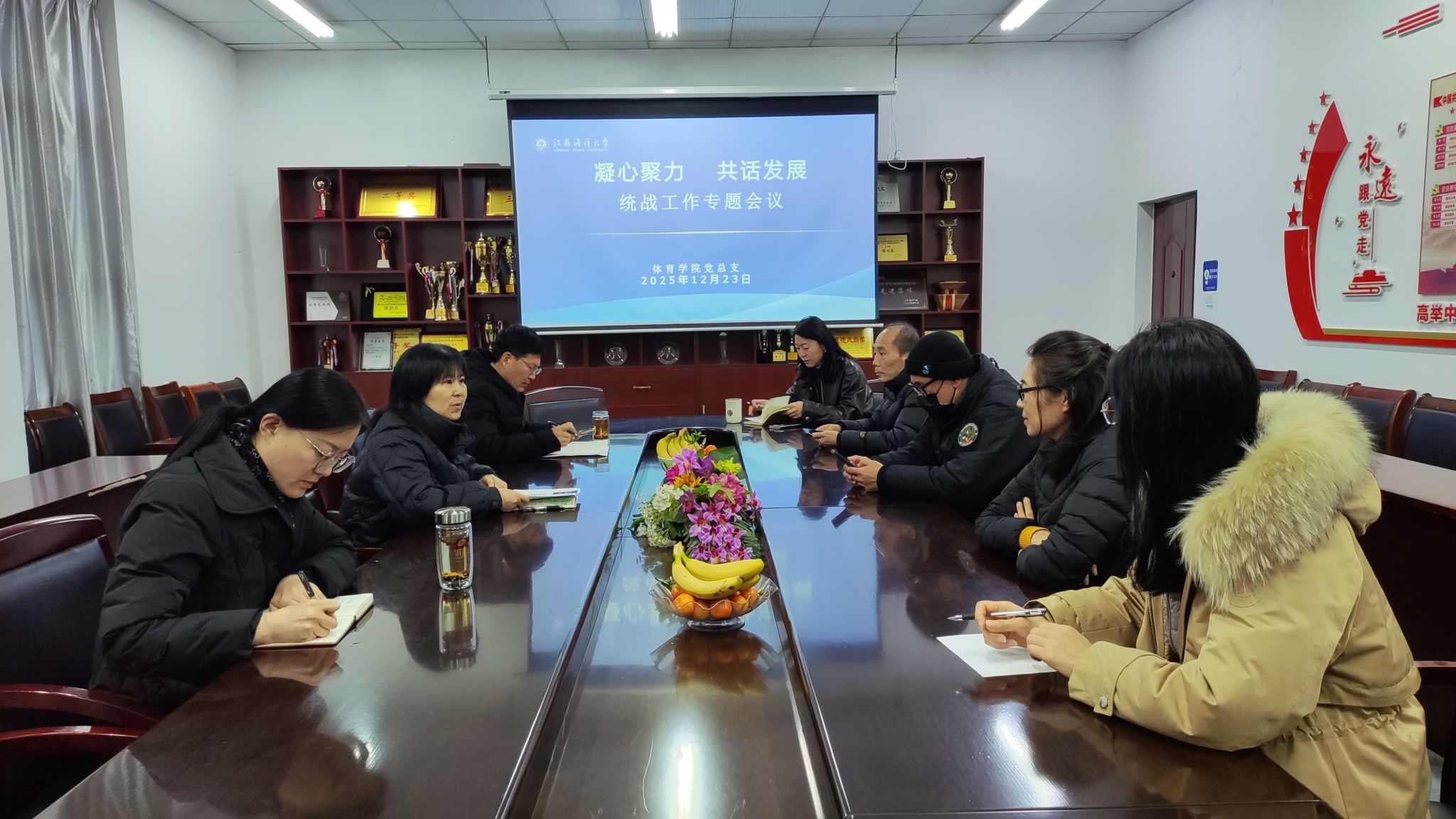 20251223日上午,体育学院在214会议室召开“凝心聚力 共话发展”统战工作专题会议,民主党派及党外知识分子代表参会,党总支书记张萍主持会议