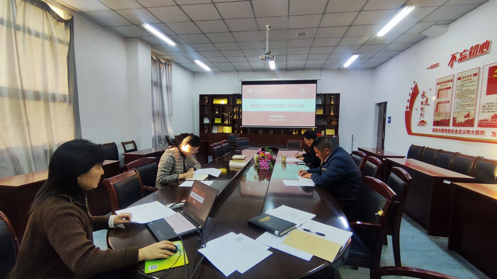 11月3日下午,体育学院党总支理论学习中心组第八次集中学习会在学院会议室召开,党总支书记张萍主持会议,学院领导班子成员及总支委员参加学习。