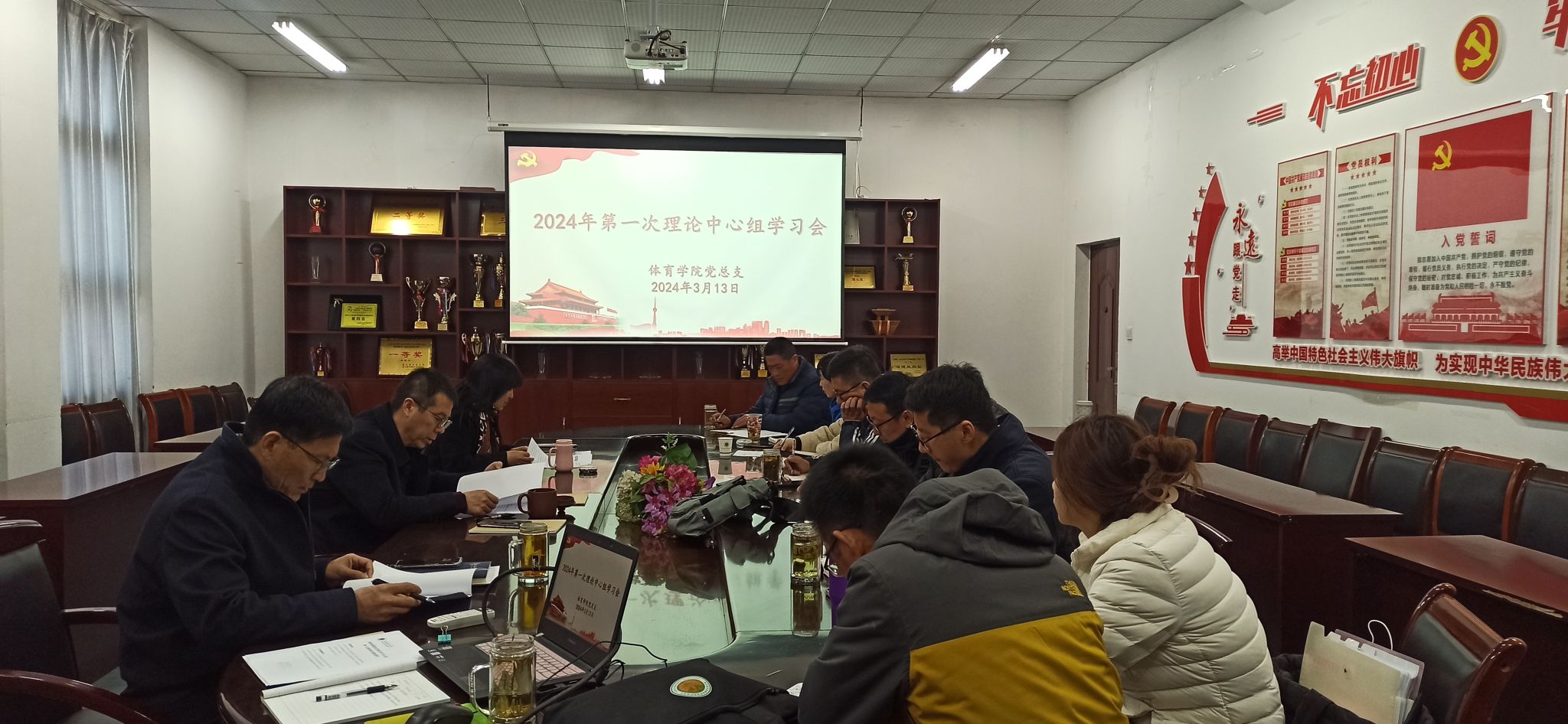 3月13日上午,体育学院党总支在学院会议室召开2024年第一次理论学习中心组学习会,会议由党总支书记张萍主持,学院领导班子、总支委员及各党支部全体委员参加了学习会。