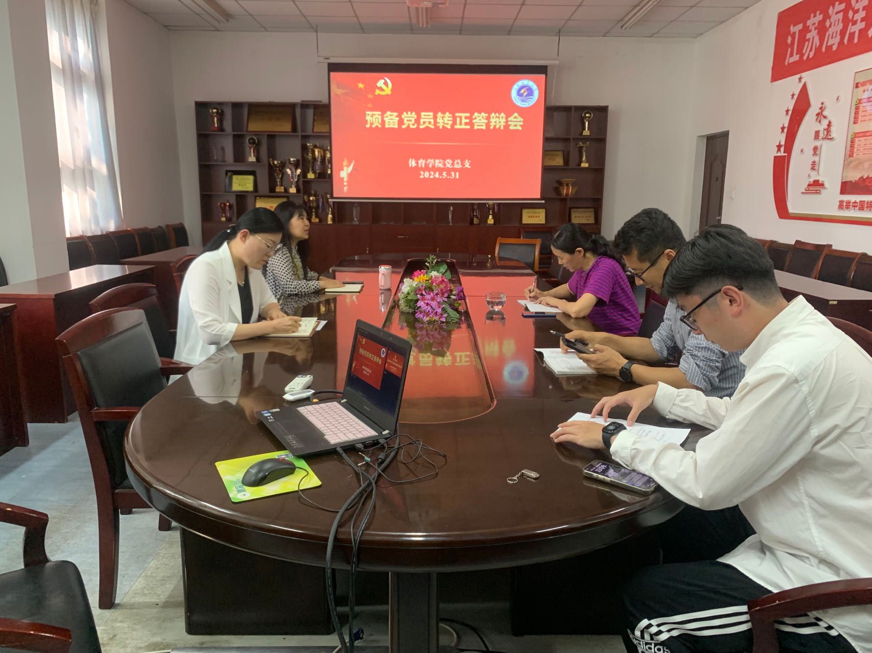 为加强对预备党员的培养和考察,推进党员发展规范化和标准化,按照《江苏海洋大学发展学生党员工作“三投票三公示一答辩”实施细则》工作要求,5月31日下午,体育学院党总支在学院会议室召开预备党员转正答辩会,会议由党总支书记张萍主持,副书记李淑华、总支委员张桂玲、学生党支部书记仝友鹏参加了会议。