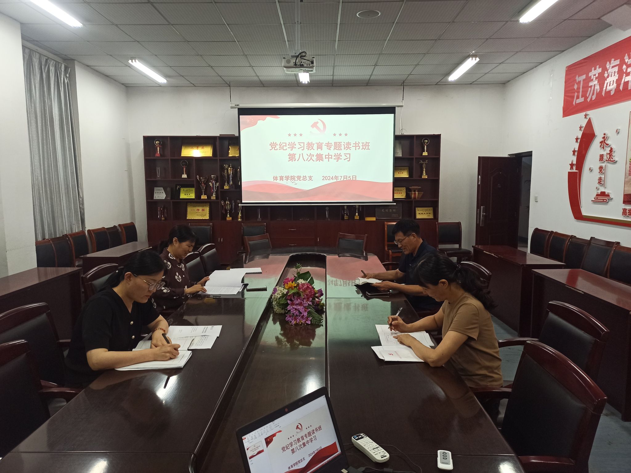体育学院党纪学习教育专题读书班第八次集中学习会于7月5日下午在学院会议室召开,党总支书记张萍主持学习会,学院领导班子成员及总支委员参加了学习。