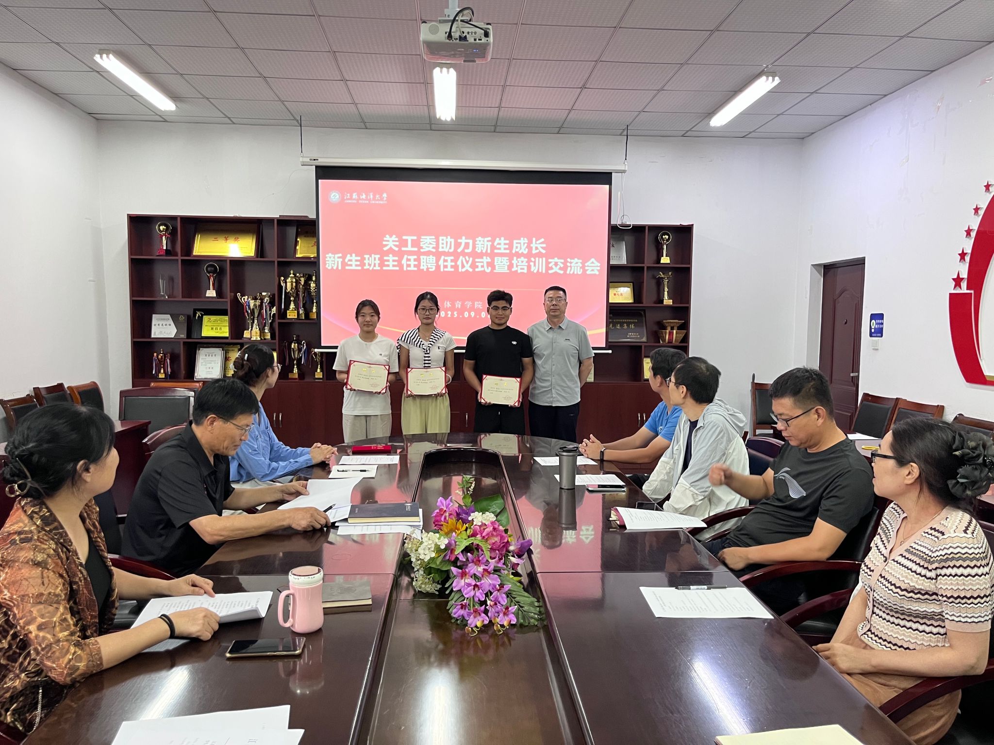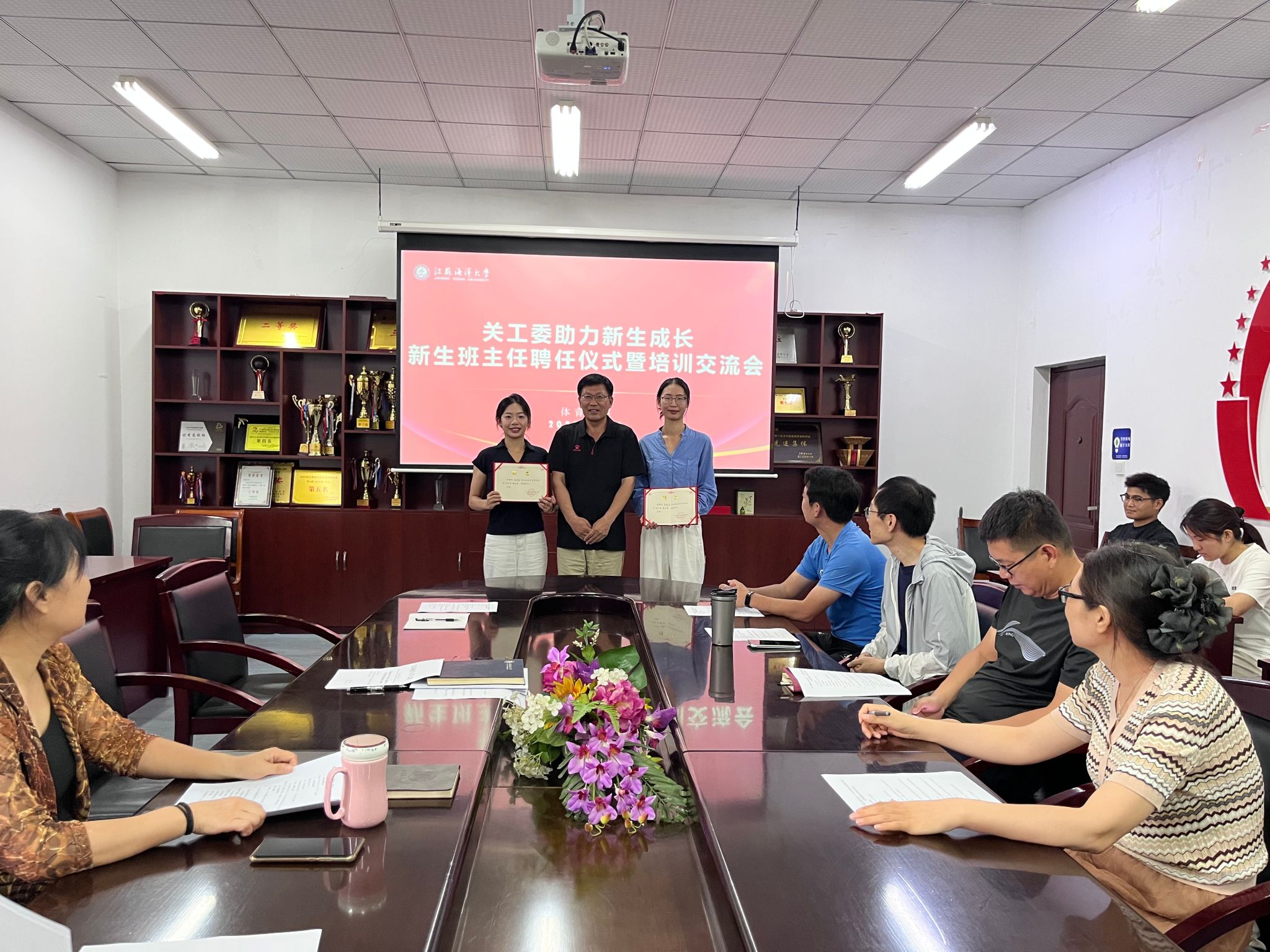 张伦厚为2025级新生班主任颁发聘书,赵宏为新生班主任助理颁发聘书,进一步明确了新生班级管理队伍的职责。培训环节,大家集体学习了《江苏海洋大学班主任队伍建设实施办法》《江苏海洋大学学生心理危机干预工作实施办法》。全体参会人员围绕所学文件,结合新生适应引导、班级学风建设、学生心理健康等学生工作进行了深入交流。