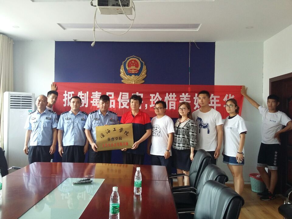 2017年7月7日,淮海工学院体育学院大学生社会实践基地挂牌仪式在连云港市公安局海州分局禁毒大队隆重举行。为了与市公安局海州分局禁毒大队形成长效合作,为青年大学生营造“无毒”的健康生活环境,淮海工学院体育学院“生命光华”暑期社会实践小分队肩负重任,全力迎接挑战。在校后勤管理处徐莉老师和体育学院分团委书记武传钟的带领下,“生命光华”暑期社会实践小分队全体队员们与连云港市公安局海州分局禁毒大队的警官们开展交流活动,禁毒大队队长杨再兴警官为参加社会实践的同学们耐心讲解了警务人员的日常工作内容,介绍了很多关于毒品的知识,让同学们明白了毒品的危害性。社会实践小分队在与警务人员的相互交流中了解到禁毒大队工作人员的敬业与辛苦,了解毒品对自身、家庭及社会的危害性,做到远离毒品从自身做起。