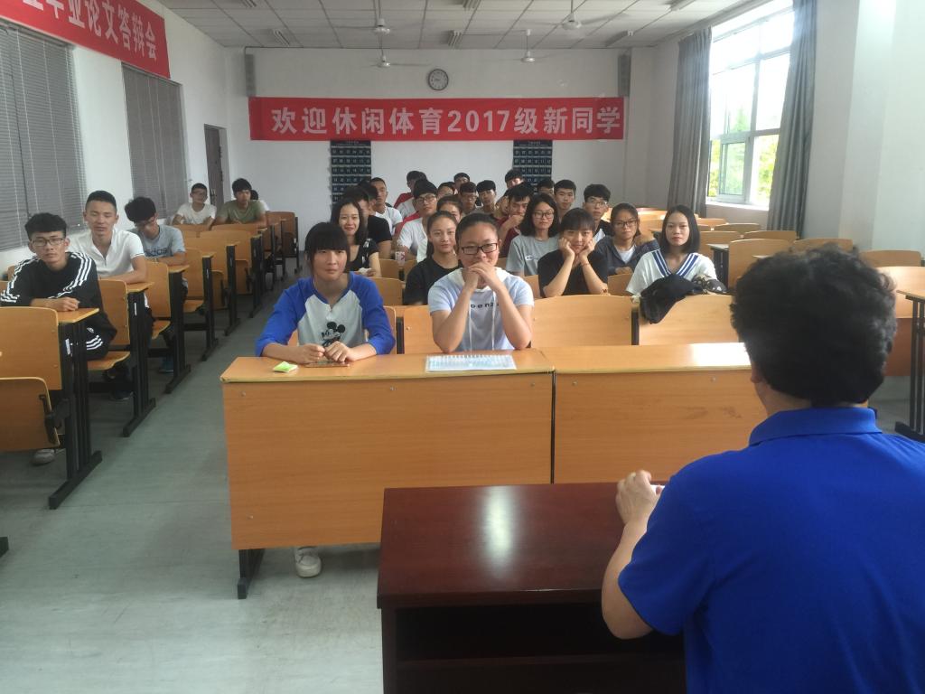 2017年9月10日上午9:00,在主体育场212多媒体教室举行体育学院2017级新生入学典礼,典礼上体育学院党总支书记刘传祥为2017级休闲体育全体新生们做大学生行为规范教育主题讲座,班主任韩传来、辅导员武传钟、体育学院学生会学生干部们参加了本次报告会。