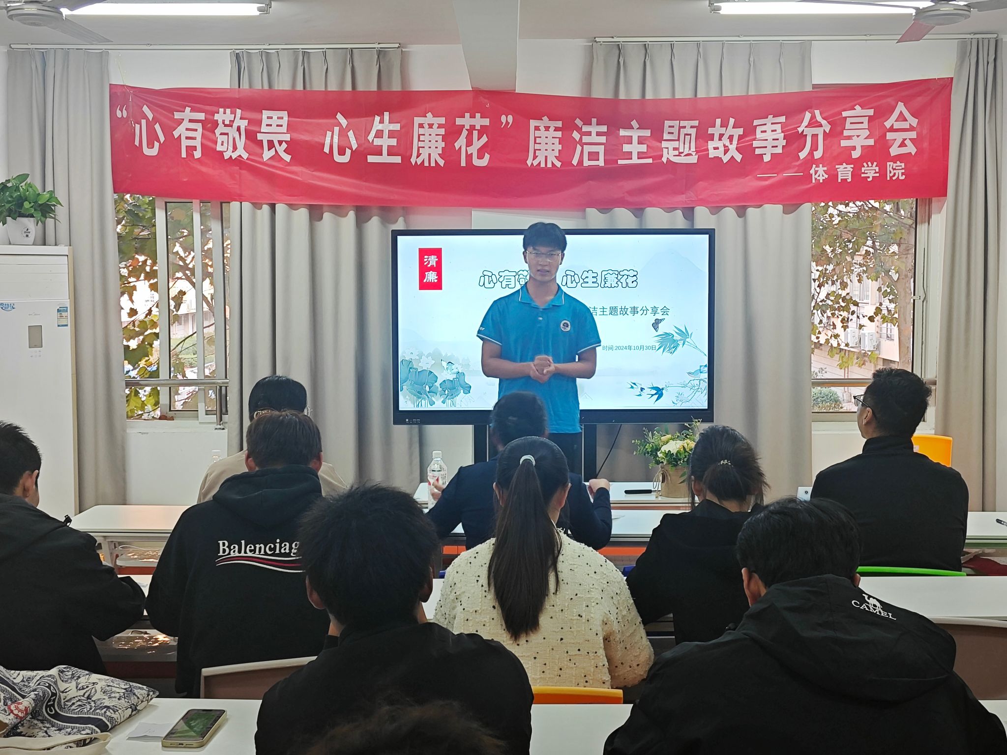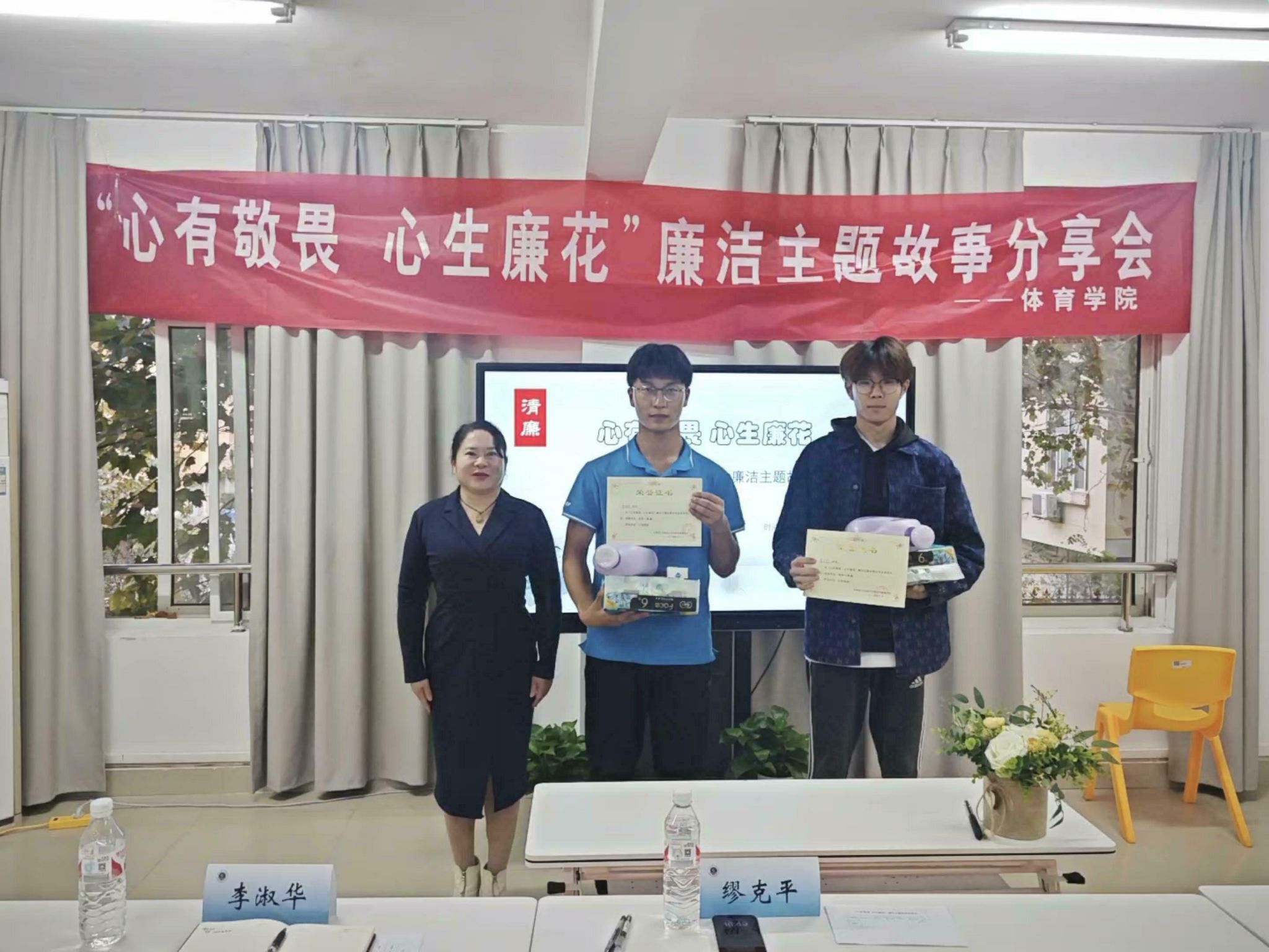 为扎实推动党纪学习教育,营造校园廉洁文化氛围,体育学院于10月30日在A9-A10学生一站式社区举行“心有敬畏 心生廉花”廉洁主题故事分享会,校纪委审查调查处处长缪克平、体育学院党总支副书记李淑华、体育学院学工办主任仝友鹏出席活动并担任评委。
