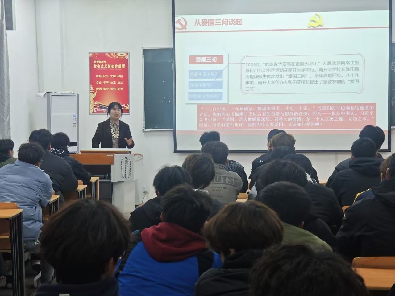 张萍重点围绕“我们该怎么爱国”进行了详细阐述,她表示要做到三个方面:第一、提升政治素养,树立制度自信。她用国家发展的真实数据证明,只有社会主义才能救中国、强大中国。第二、不轻信不盲从,提高鉴别能力。作为新时代的大学生,应以理性约束情感,学会辨别网络信息之真伪,对各种信息进行客观、理性的分析。第三、规范日常行为,践行爱国使命。作为学生要努力学习专业知识,遵守法律法规,尊重社会公德,爱护公共环境,用实际行动践行爱国使命,让爱国主义精神在日常行为中得到充分体现。
