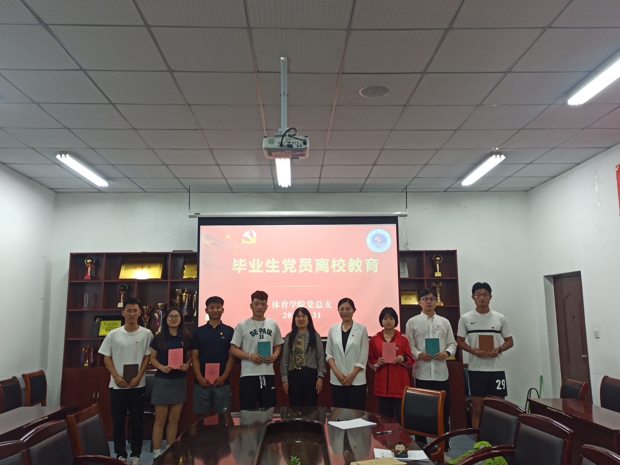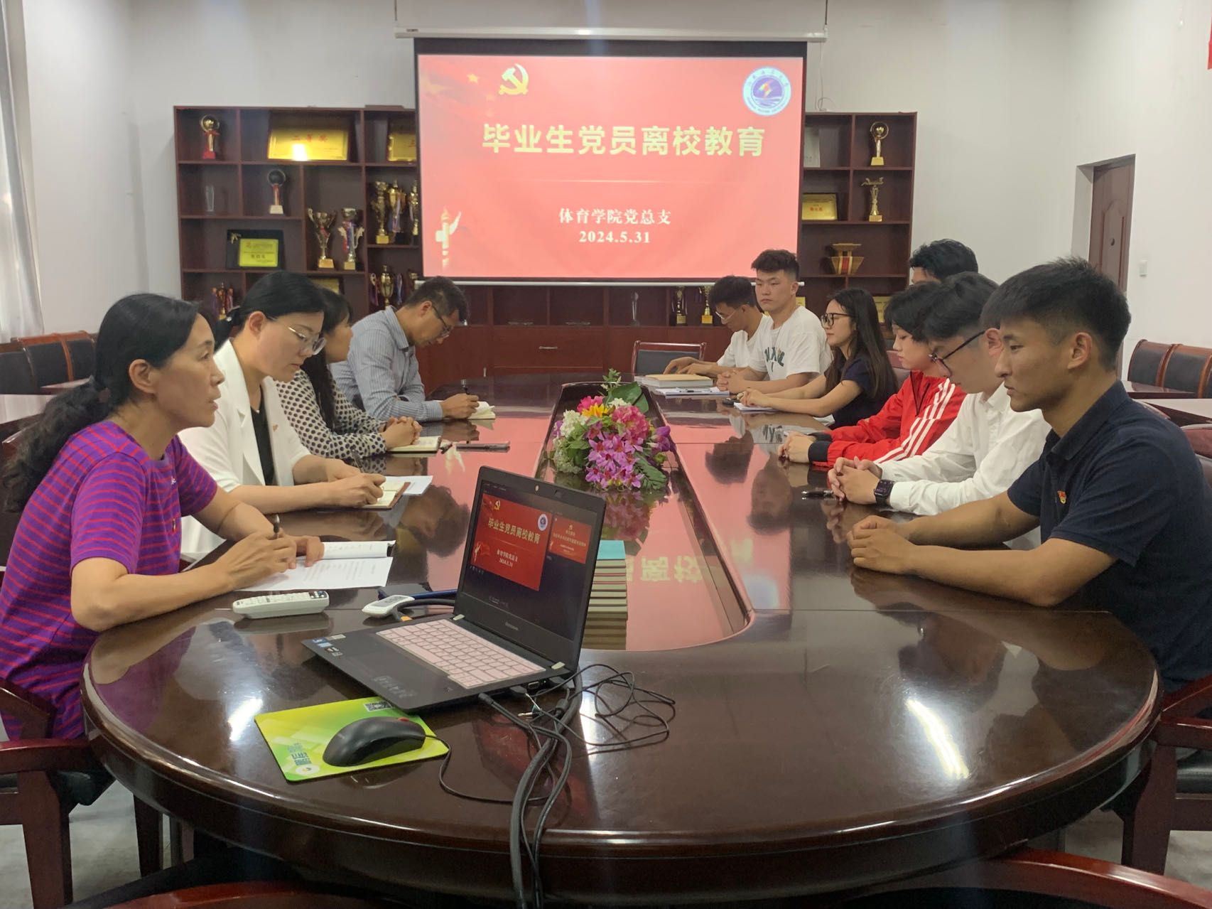 为了进一步加强毕业生党员纪律意识与党性修养,引导毕业生党员充分发挥先锋模范作用,以良好的精神风貌和饱满的工作热情走出校园、迈入社会、踏上新征程,2024年5月31日,体育学院在会议室开展2024届毕业生党员离校教育大会。体育学院党总支书记张萍、党总支副书记李淑华、党政办主任张桂玲、学生党支部书记仝友鹏以及全体毕业生党员参加会议,会议由党政办主任张桂玲主持。