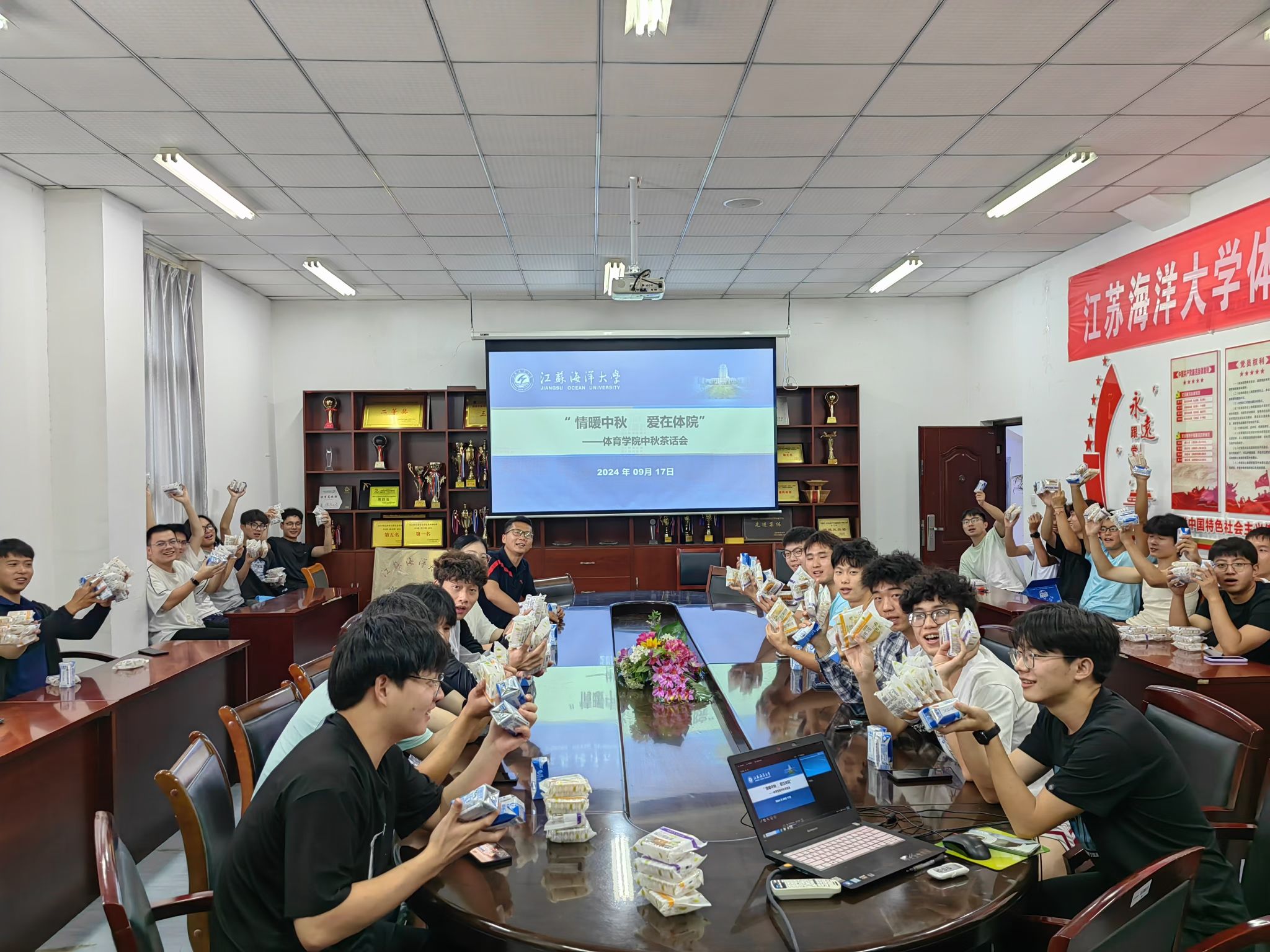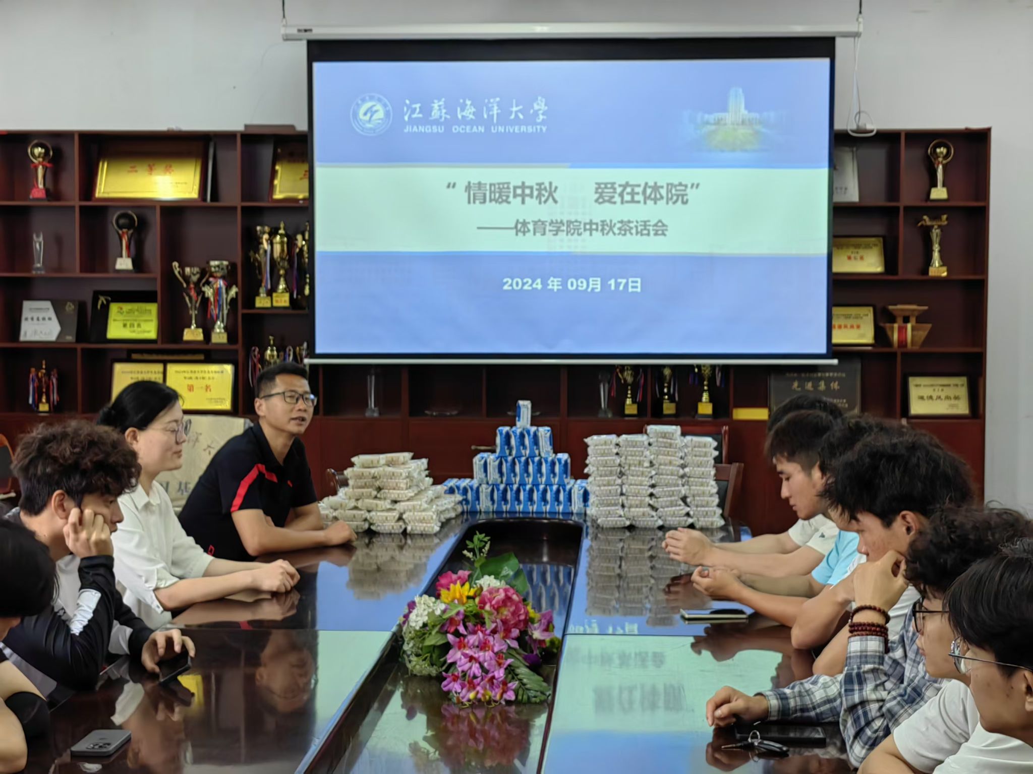 在中秋佳节来临之际,为倾听同学们的心声,传达学院对同学们的关爱。9月17日上午,体育学院在212教室和学院会议室分别为新生、留校老生举行“情暖中秋 爱在体院”中秋茶话会。学院党总支副书记李淑华出席活动,学院全体2024级新生、假期留校老生参加。活动由学工办主任仝友鹏主持。
