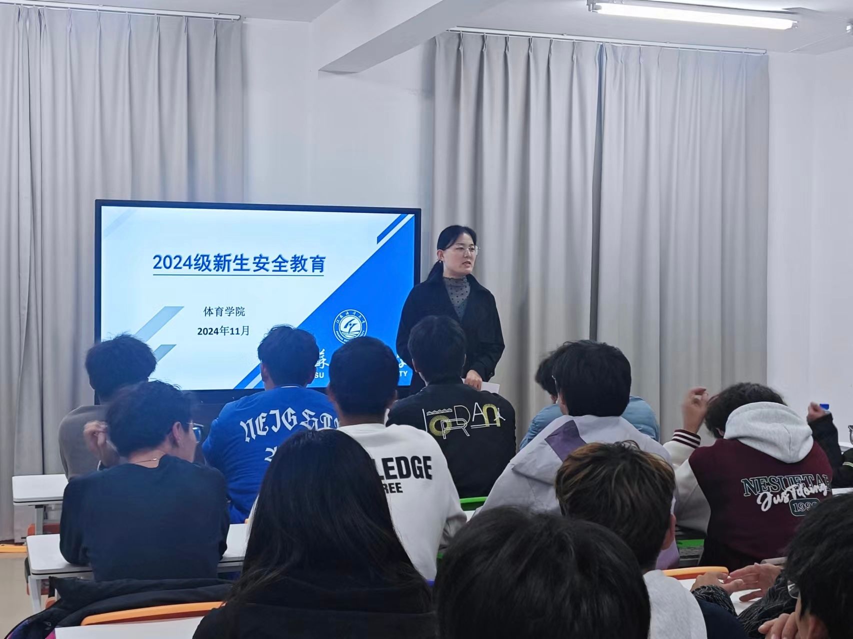 为提高学生安全防范意识,增强安全防范能力,体育学院于11月12日晚在A9-A10“一站式”学生社区开展了安全教育讲座,讲座由体育学院党总支副书记李淑华主讲,学院2024级全体学生参加。