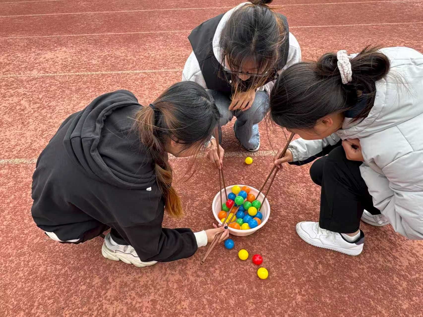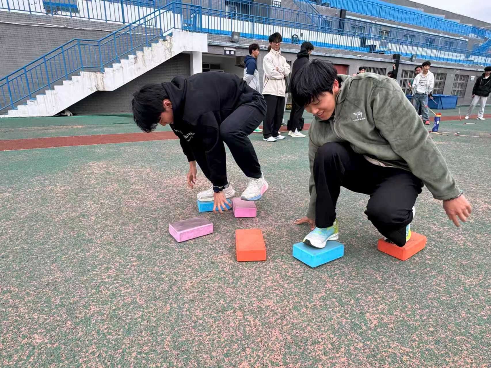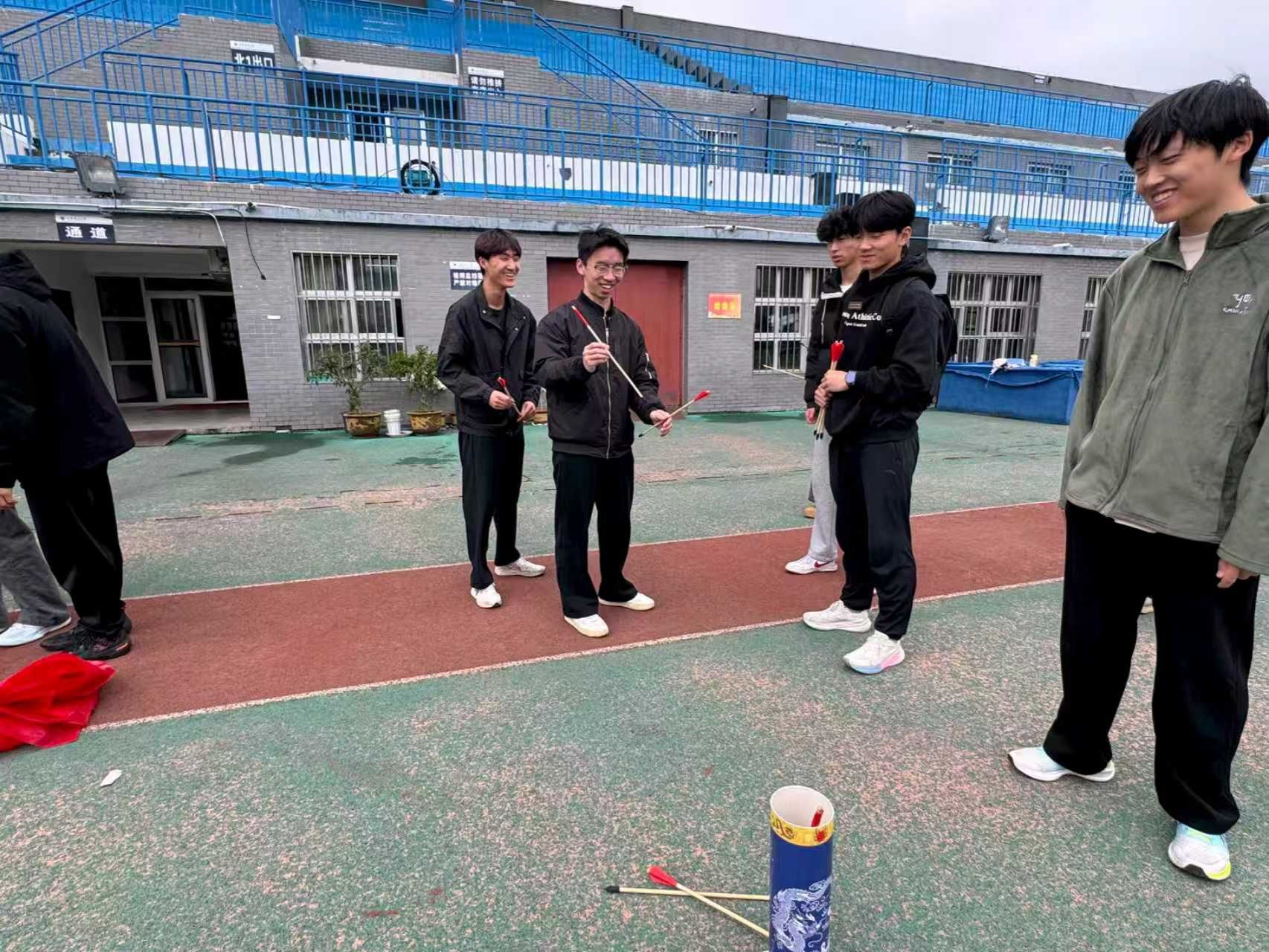活动现场设置了夹乒乓球、投壶、砖头过桥等趣味项目,兼顾趣味性与协作性。同学们热情高涨,夹乒乓球时屏气凝神、小心翼翼,投壶环节凝神瞄准、体验传统体育文化魅力,砖头过桥项目中相互提醒、默契配合,充分展现了体育学子的活力与风采。活动现场掌声、欢呼声此起彼伏,氛围轻松热烈。