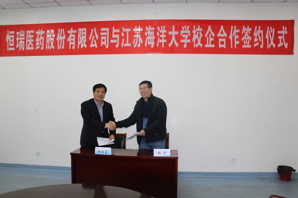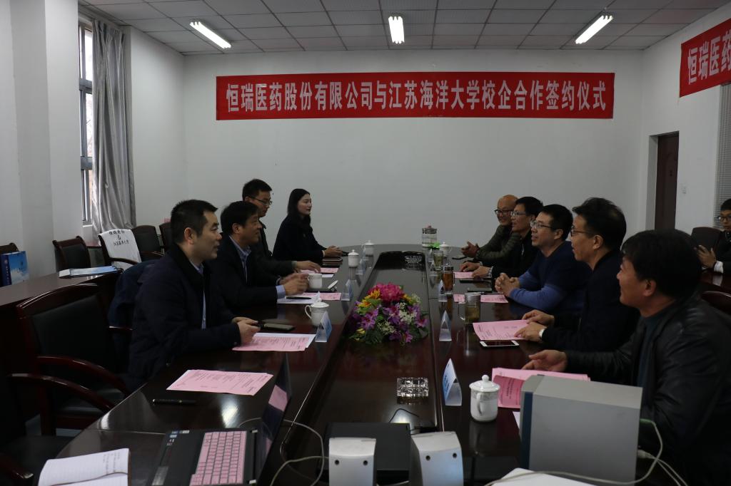 关于江苏恒瑞医药股份有限公司与江苏海洋大学“校企共育才,健康中国人”为主题的校企合作协议签订仪式于11月23日上午10点在体育学院会议室顺利举行。出席本次签订仪式的领导有江苏恒瑞医药股份有限公司副总裁徐宜富先生,体育学院党总支书记兼常务副院长赵宏同志,会议由体育学院副院长张伦厚主持。