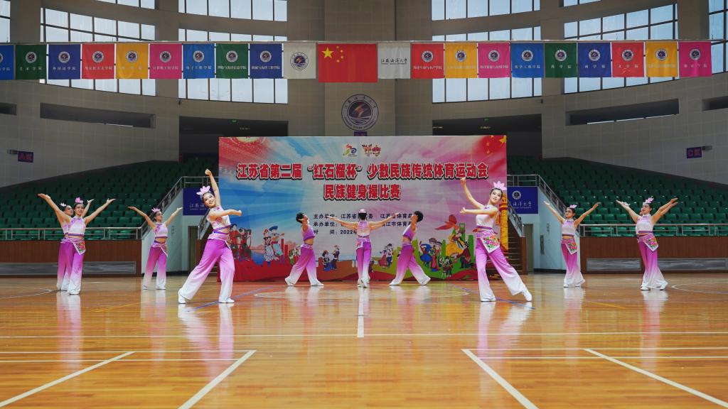 为备战2023年全国第十二届民族运动会,江苏省第二届“红石榴杯”民族健身操由省民族宗教事务委员会、省体育局主办。因疫情影响民族健身操比赛首次以线上比赛、线下评判的方式进行。主会场设在镇江市,省市领导、裁判员、嘉宾在主会场通过现场大屏观看参赛实况录像,裁判员进行评判,观众通过 5G 云直播,线上观看比赛。