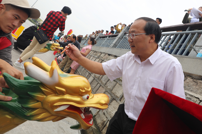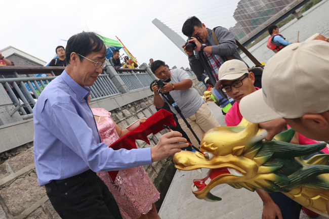9月27日下午,我校第九届大学生龙舟争霸赛暨第二届皮划艇赛在东盐河畔举行,来自全校15个学院200多名龙舟和皮划艇运动员上演了一场激烈的争霸赛。校领导杜军、王洪法出席了比赛开幕式并为龙舟点睛。