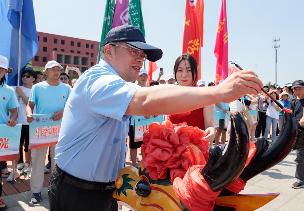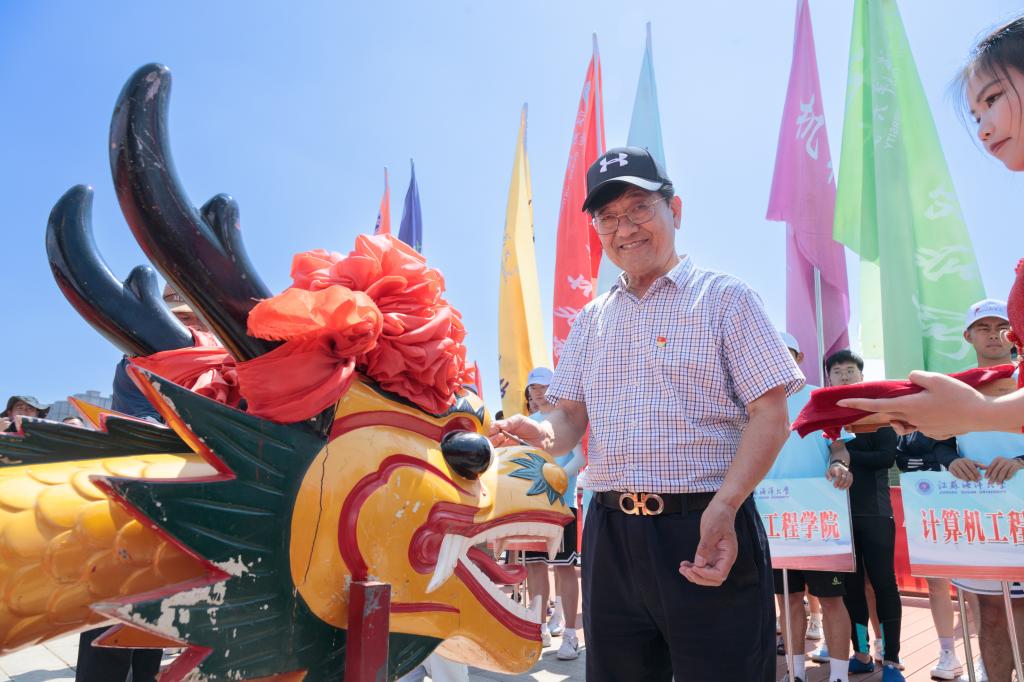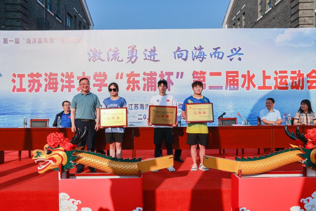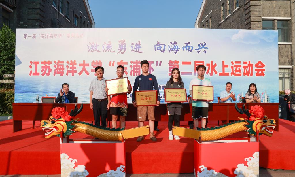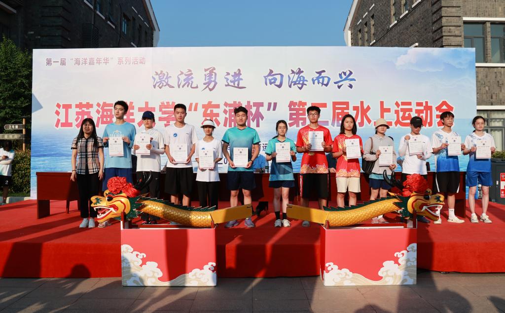 校党委书记王自力和江苏东浦管桩有限公司党委书记谭学立为龙舟点睛,校长宁晓明宣布比赛开始。经过激烈角逐,环境与化学工程学院荣获龙舟赛一等奖,应用技术学院、电子工程学院、海洋科学与水产学院荣获二等奖,土木与港海工程学院、理学院、药学院、文法学院荣获三等奖,其他单位获得优胜奖。应用技术学院的陶垠旭获得学生组皮划艇单人艇第一名;马卡洛夫海洋工程学院的徐艺萌、王孜恒获得学生组皮划艇混合双人艇第一名;应用技术学院的崔晓琳、许华娣获得教工组皮划艇混合双人艇第一名。