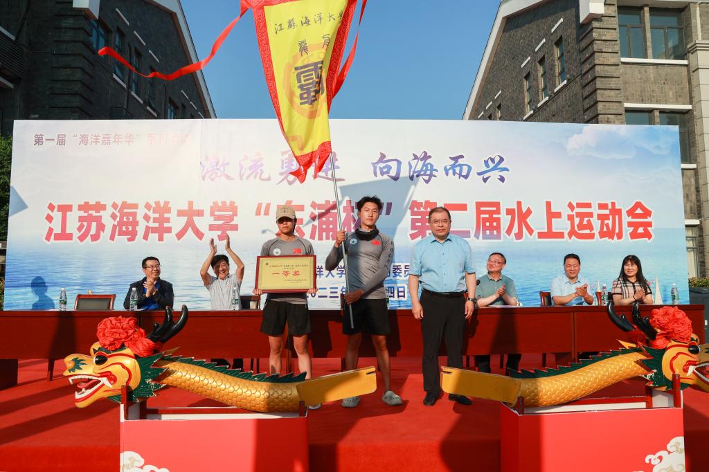 校党委书记王自力为龙舟争霸赛一等奖获奖单位颁奖并授予“霸主旗”。“激流勇进 向海而兴”东浦杯第二届水上运动会,也是我校第一届海洋嘉年华系列活动之一。现场展示了习近平同志论海洋强国宣传展板,让广大师生关注海洋事业发展,提升保护海洋资源、关爱海洋生态环境意识。